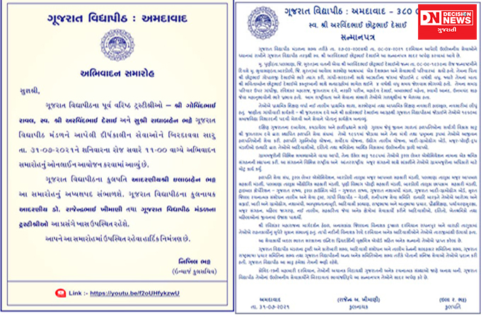 આજરોજ 11:૦૦ કલાકે ગૂજરાત વિદ્યાપીઠના પૂર્વ વરિષ્ઠ ટ્રસ્ટીઓ શ્રી ગોવિંદભાઈ રાવલ સ્વ શ્રી અરવિંદભાઈ દેસાઈ અને સુશ્રી રાધાબહેન ભટ્ટ ગૂજરાત વિદ્યાપીઠ મંડળને આપેલી દીર્ધકાલીન સેવાઓને બિરદાવવા સારું અભિવાદન સમારોહનું ઓનલાઈન આયોજન કરવામાં આવ્યું છે.