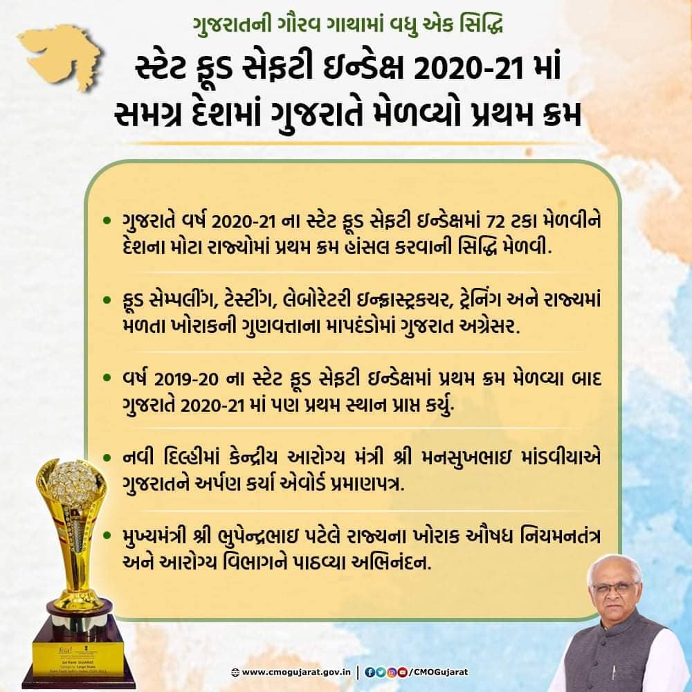 ગુજરાતે વર્ષ 2020-21 ના સ્ટેટ ફૂડ સેફટી ઇન્ડેક્ષમાં 72 ટકા મેળવીને દેશના મોટા રાજ્યોમાં પ્રથમ ક્રમ હાંસલ કરવાની સિદ્ધિ મેળવી છે. નવી દિલ્હીમાં કેન્દ્રીય આરોગ્ય મંત્રી શ્રી મનસુખભાઇ માંડવીયાએ આ માટેનો એવોર્ડ અને પ્રમાણપત્ર ગુજરાતને અર્પણ કર્યા હતા.