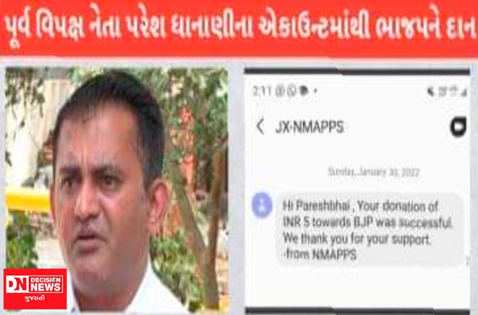 ગુજરાત: અલ્યા ભારે કરી ! વિપક્ષના આ પૂર્વ નેતાના એકાઉન્ટમાંથી રાત્રે 2 વાગ્યે ભાજપને 5 રૂપિયાનું દાન કર્યાનો મળ્યો મેસેજ વાયરલ થઇ રહ્યો છે ત્યારે વિપક્ષના પૂર્વ નેતા પરેશ ધાનાણી પણ અચરજમાં છે ત્યારે લોકોમાં આ મુદ્દો ગરમમસાલો બન્યો છે.