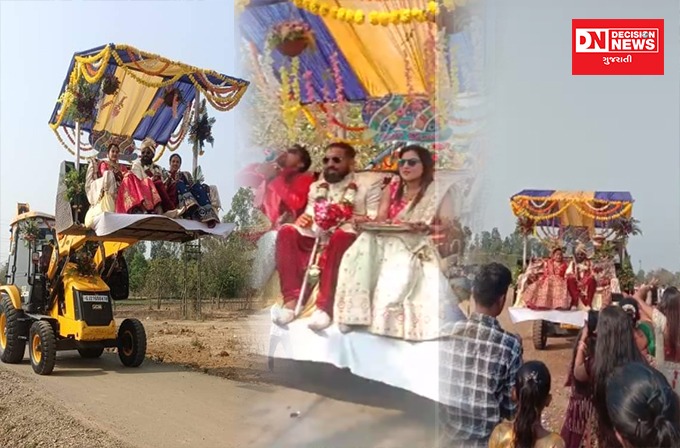 Decision Newsને મળેલી માહિતી મુજબ ચીખલી તાલુકાના કલીયારી ગામના ઢોડીયાવાડ ફળીયામાં રહેતા ગુલાબભાઈ ઘુરીયાભાઈ પટેલના બે સુપુત્રો કેયુર પટેલ અને મયુર પટેલના લગ્ન યોજવાના હોય જેમાં કેયુર પટેલના લગ્ન ગુરુવારે તેમના જ કલીયારી ગામે ઢોડિયાવાડ ફળિયામાં રહેતી ભૂમિકા પ્રવીણભાઈ પટેલ સાથે યોજાયા હતા. આ લગ્નમાં ગામના લોકો તેમજ સગા સંબંધીઓ પધાર્યા હતા અને ગામમાં જાન વરઘોડો ડીજે મ્યુઝિકના તાલે કાઢવામાં આવ્યો હતો. જેમાં સૌ ઝૂમી રહ્યા હતા અને એકાએક શેરવાનીમાં સજ્જ વરરાજા શરગણેલા જેસીબી મશીનમાં સવાર થયાં તે જોઈ લોકોનો ઉત્સાહ બેવડાયો હતો. સમગ્ર ગામ અને પંથકમાં ધૂમ મચી હતી. જોકે, લગ્ન તો આદિવાસી પરંપરા મુજબ જ લેવાયાં હતા. ત્યારે વરરાજા અને દુલ્હન બન્ને એકસાથે જેસીબીમાં બેસી નાચતા હોય એવા વીડિયો જાનૈયાઓએ બનાવી વાયરલ કરતા હાલ આ વીડિયો સોશિયલ મીડિયા પર ધૂમ મચાવી રહ્યો છે.