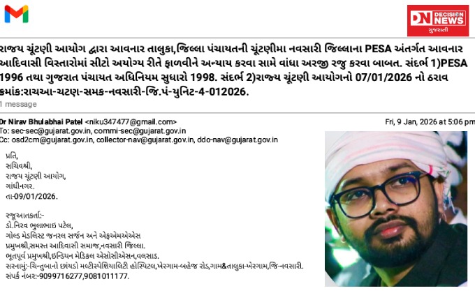 ખેરગામના યુવા લીડર અને જાણીતા સર્જન ડો.નિરવ ભુલાભાઇ પટેલ દ્વારા ગુજરાત રાજય ચૂંટણી આયોગ દ્વારા આ વર્ષે યોજાનાર સ્થાનિક સ્વરાજ્યની તાલુકા જિલ્લા પંચાયતની ચૂંટણીઓમાં અનામત સીટોની ફાળવણીમા આદિવાસી અને ઓબીસી સમાજને થયેલા અન્યાય બાબતે લોકોમાં પ્રવર્તી રહેલ આક્રોશ બાબતે આયોગ સમક્ષ વાંધા અરજી રજુ કરીને ફરીથી સીટોની ફાળવણી ગ્રાઉન્ડ લેવલની હકીકત અને વસ્તીને આધારે યોગ્ય રીતે કરવા માંગ કરી છે.આ બાબતે રાજય ચૂંટણી આયોગને લખેલા પત્ર બાબતે ડો.નિરવ ભુલાભાઇ પટેલે દ્વારા મીડિયા સાથેની વાતચીતમા જણાવ્યું હતું કે અમે સંદર્ભ 1)PESA 1996 તથા ગુજરાત પંચાયત અધિનિયમ સુધારો 1998. સંદર્ભ 2)રાજ્ય ચૂંટણી આયોગનો 07/01/2026 નો ઠરાવ ક્રમાંક:રાચઆ-ચટણ-સમક-નવસારી-જિ.પં-યુનિટ-4-012026 ના આધારે આવનાર તાલુકા-જિલ્લા પંચાયતની સ્થાનિક સ્વરાજની ચૂંટણીઓમા નવસારી જિલ્લામાં તાલુકા જિલ્લા પંચાયતોની સીટોમા અનામતની વહેંચણી એકદમ મનસ્વી અને અણધડ રીતે આદિવાસી અને ઓબીસી સમાજને ભારે અન્યાય થાય એ રીતે કરવામાં આવેલ છે.